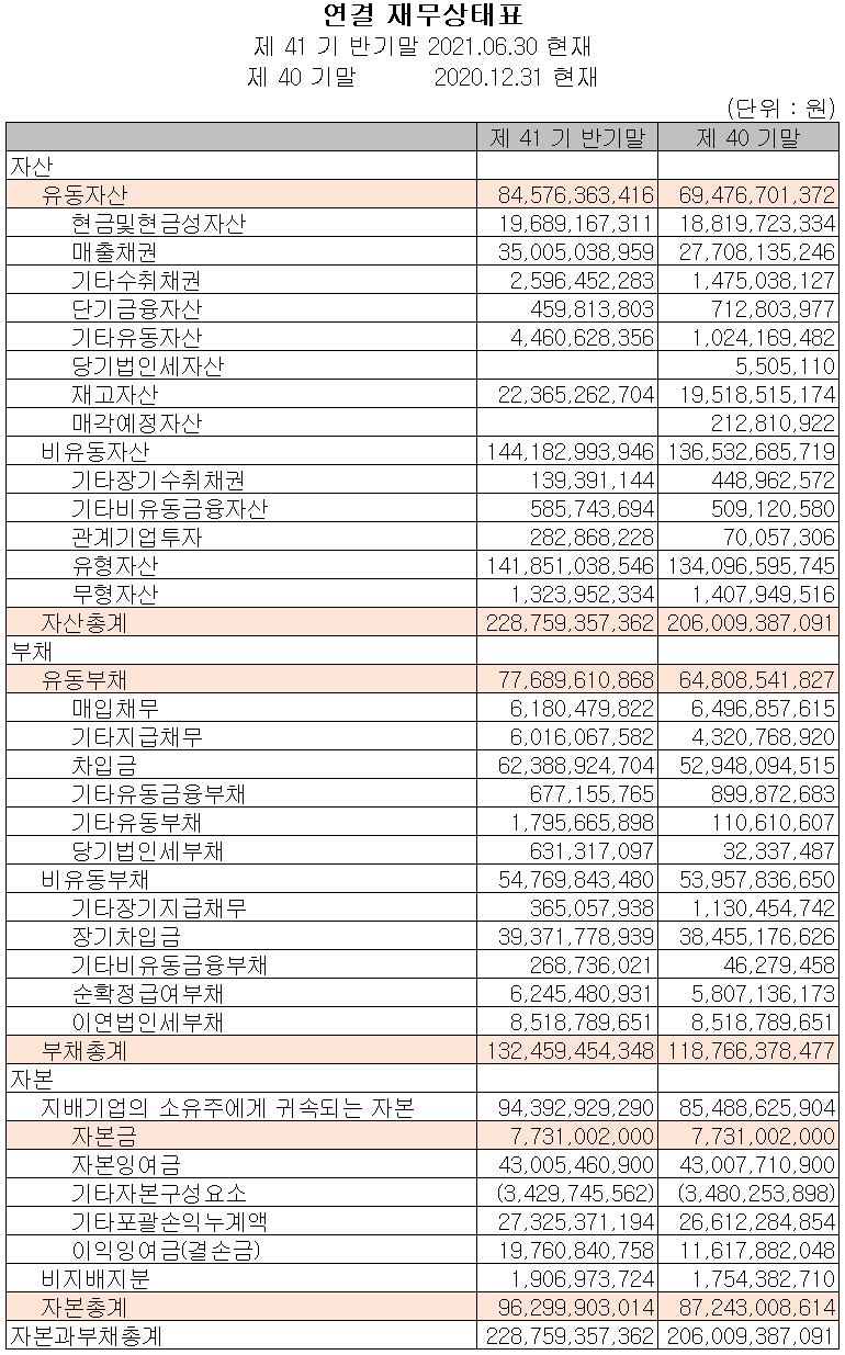 당사의 2021년 상반기 말 기준 자산 총계는 전기보다 11%(227억 원) 증가한 2,288억 원으로 매출채권, 기타유동자산 및 유형자산의 증가에 기인합니다. 부채 총계는 11.5%(137억 원) 증가한 1,325억 원으로 차입금 및 기타 유동부채의 증가가 주된 요인입니다.