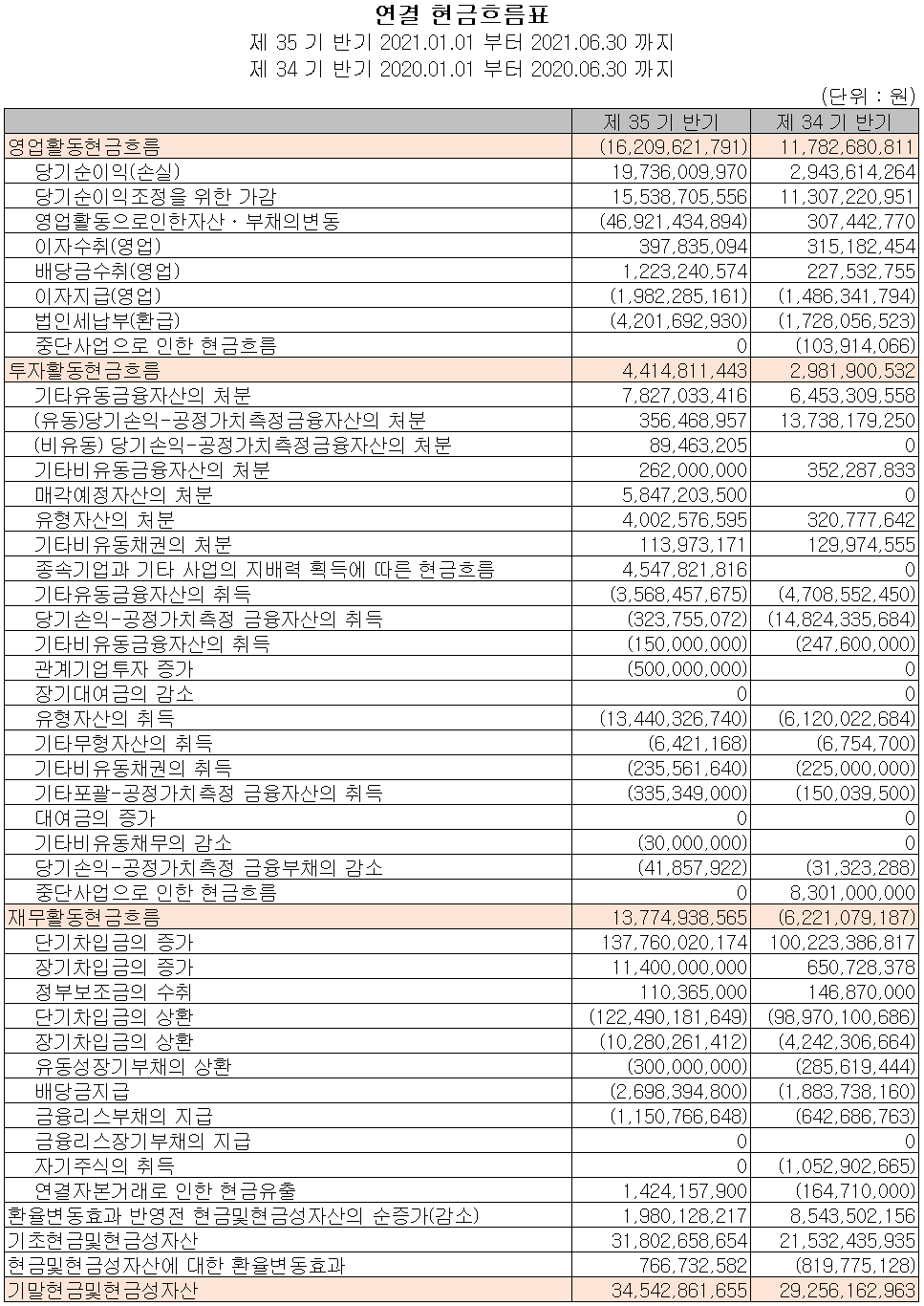 지난 상반기 영업활동 현금흐름에서는 이익규모가 증가했으나, 운전 자산(재고자산 및 매출채권의 증가 등)의 변동으로 총 162억 원의 현금이 유출되었습니다. 투자활동에서는 유무형 자산의 취득이 있었으나 유동성금융자산의 처분 및 매각 예정 자산과 유형 자산의 처분 등으로 44억 원의 현금이 유입되었습니다. 재무활동에서는 차입금을 조달하여 부채를 상환하였고, 배당금을 지급하였습니다. 2021년 6월 30일 기준 현금 및 현금성 자산은 전년 동기보다 53억 원이 증가한 345억 원을 보유하고 있습니다.