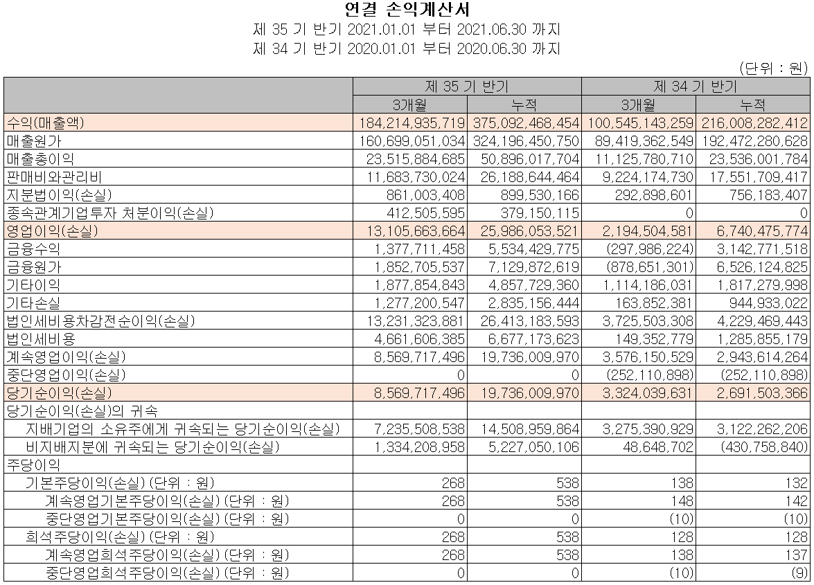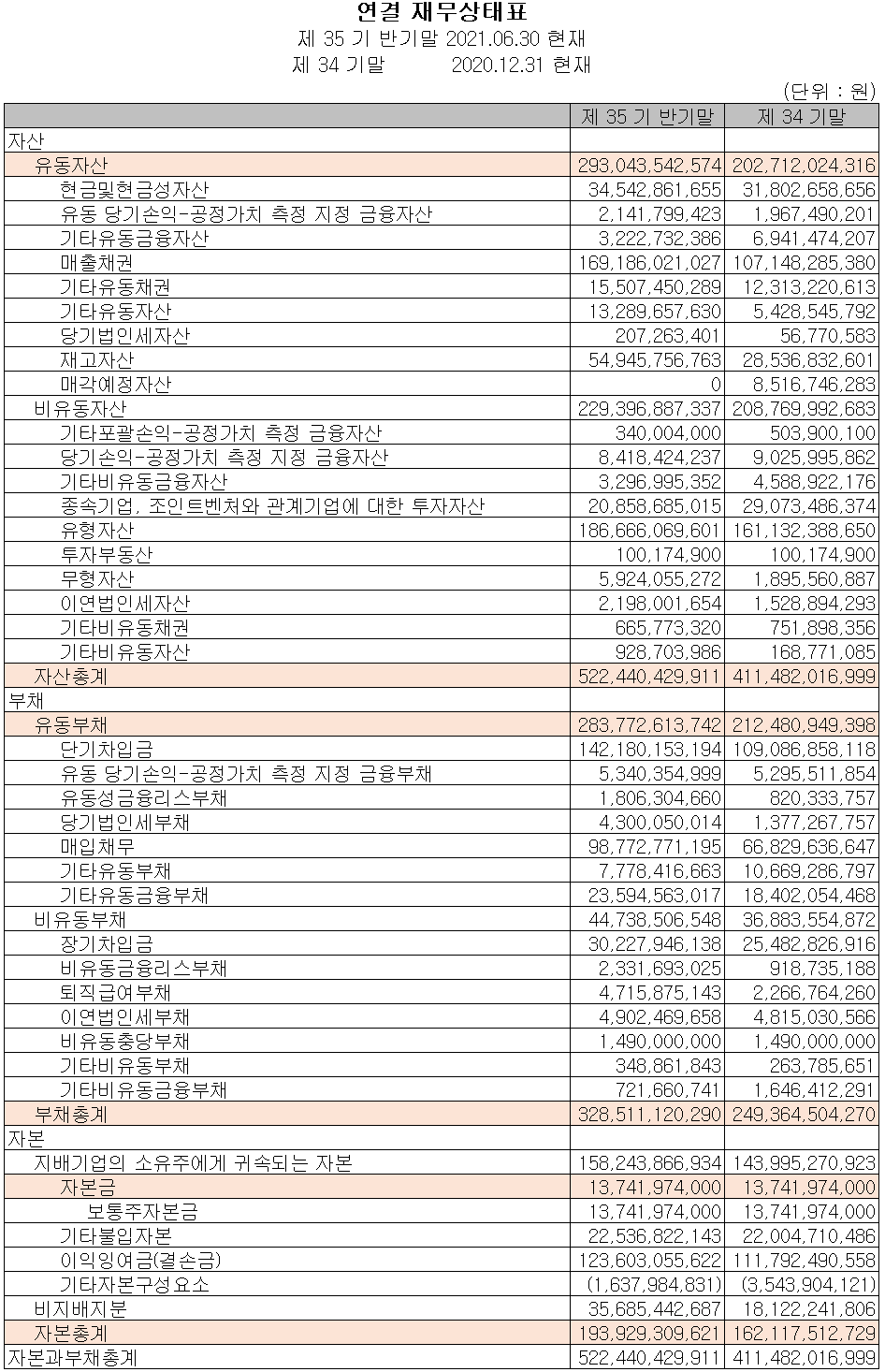 2021년 상반기 말 기준 자산 총계는 전기보다 27%(1,110억 원) 증가한 5,224억 원으로 재고자산, 기타유동채권 등의 증가에 기인합니다. 부채 총계는 31.7%(791억 원) 증가한 3,285억 원으로 장단기 차입금 및 매입채무 등의 증가가 있었습니다.