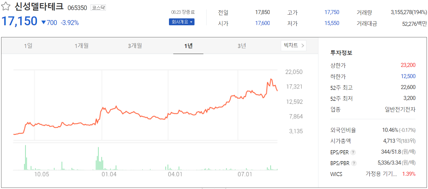 신성델타테크, 52주 최고가 경신…2차전지 관련주 수혜 - 핀포인트뉴스