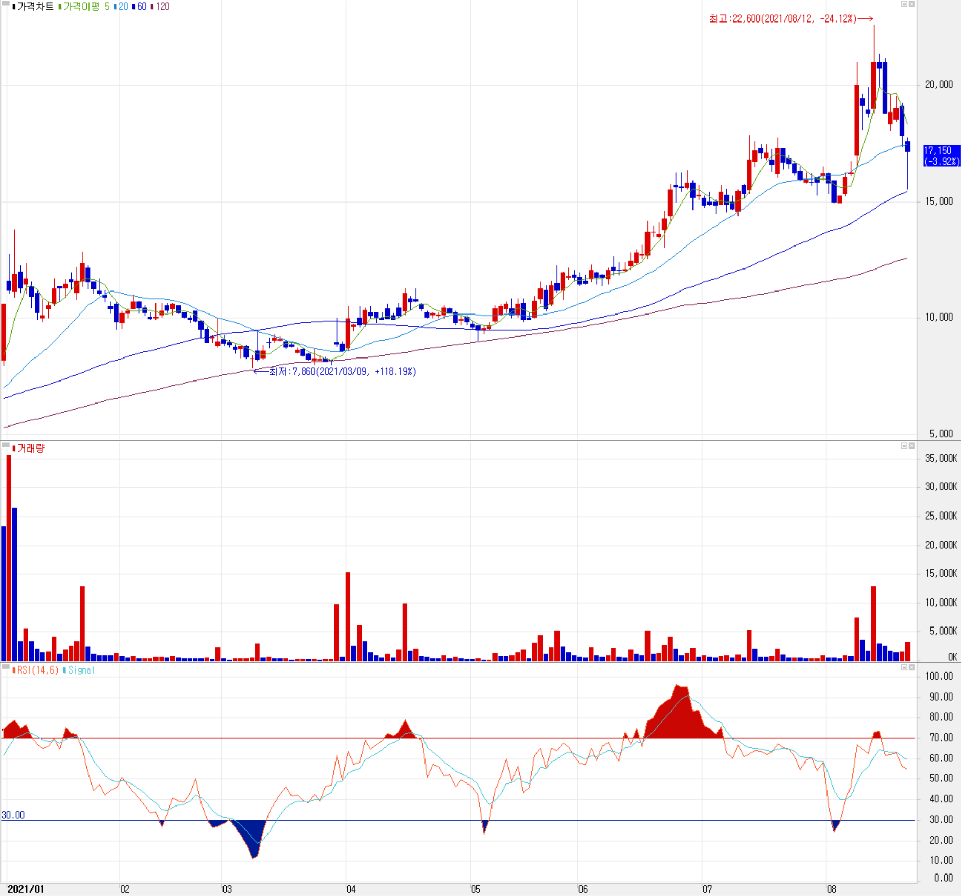 올해 들어 당사의 주가는 기존 사업인 HA 사업부문의 OEM 수요 증가에 따른 수익성 개선과 특하 2차전지 부품 사업에서 LG에너지솔루션과 함께 폴란드에 진출하면서 실적의 증가와 함께 주가도 우상향을 지속해왔습니다. 최근에는 내외 최대주주 등 임원들이 주식을 매도하면서 주가가 하락했습니다. 지난주 5 거래일 연속 순매수한 개인은 8월 23일 매도로 돌아섰으나 전반적으로 매수 위주의 거래를 하고 있는 반면, 기관과 외국인은 매도 우위를 보이고 있습니다. 차트 소견 및 사업 전망을 기반으로 한 개인적인 목표주가는 26,000원으로 설정하였고 중장기적으로 매력적인 종목이나, 최근까지의 상승에 대한 피로도 및 시장 외적인 변동성 등에 대비하여 신중한 접근이 필요하고 오늘 저점인 15,500원 선을 지지하는지 확인 후 접근할 예정입니다.