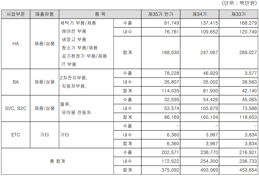 지난 상반기 HA사업부문의 매출은 1,685억 원으로 전체 매출의 45%를 차지하였으며, BA 사업부문은 1,140억 원으로 30%, SVC/B2C 사업부문은 862억 원으로 23%의 매출 비중을 나타냈습니다. HA 사업부문의 수출과 내수의 비중은 각각 54.4%, 45.6%를 기록하였으며, BA 사업부문은 수출 68.6%, 내수 31.4%의 매출 비중을 보였습니다.