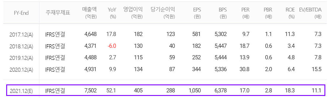 당사의 2021년 연간 추정실적은 매출액 7,502억 원으로 전년 동기 대비 52.1% 증가하고, 영업이익은 405억 원으로 202% 증가할 것으로 추정했습니다.