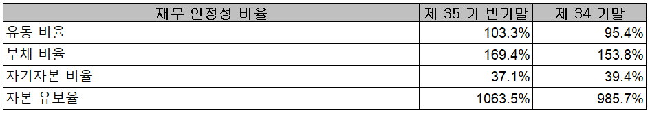 당사의 2021년 상반기 말 재무 안정성에서는 유동비율 103.3%, 부채비율 169.4%, 자기자본비율 37.1%, 자본유보율 1,063.5%를 기록하였습니다. 부채비율이 높은 편이나, 올해 들어서 2차전지 부문의 성장과 HA부문의 OEM 사업 비중 증가에 따른 매출과 수익성이 크게 개선되면서 재무상태도 더욱 개선될 것으로 판단하고 있습니다.