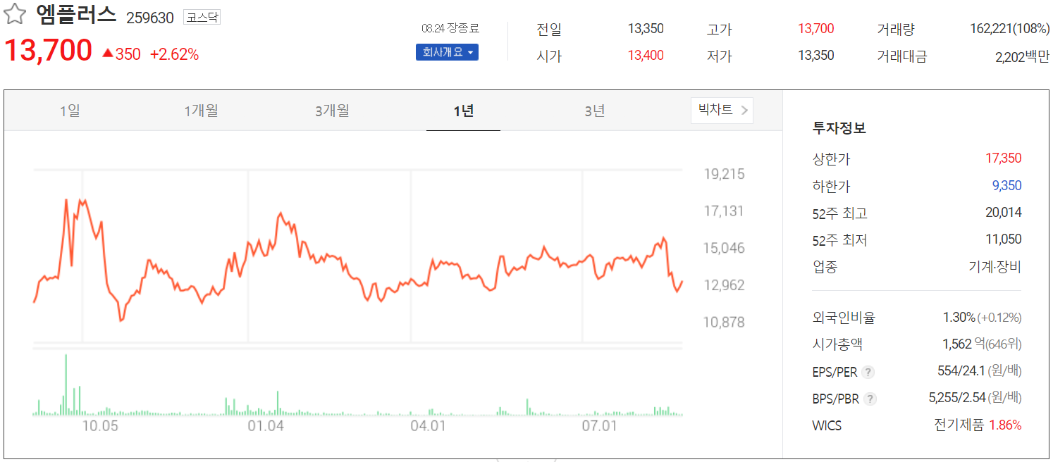 8월 24일 장 종료 기준 당사의 주가는 전 거래일보다 2.62% 오른 13,700원에 거래를 마쳤습니다. 외국인 비중은 1.3%이며, 시가 총액 1,562억 원으로 코스닥 시총 기준 646위 종목입니다.