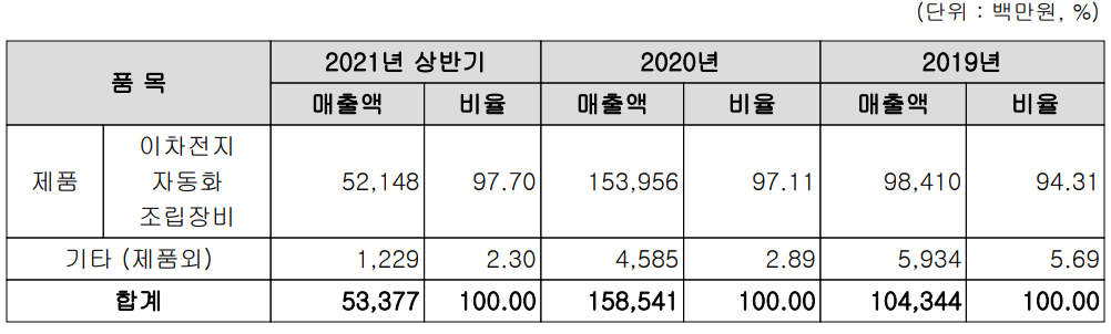 당사는 이차전지 제조장비 중 파우치형 및 각형 타입의 전기자동차용 리튬이온 2차전지 조립공정용 장비의 제조를 하고 있습니다. 조립공정에는 Notching, Stacking, Tab Welding, Packaging, Degassing 등의 세부공정이 있습니다. 따라서 전체 매출의 대부분이 2차전지 조립공정용 장비이며, 기타 고객사 생산품의 스펙 변경이나, 유닛 교체 등에 따른 부분 교체에 관련된 매출이 있습니다.