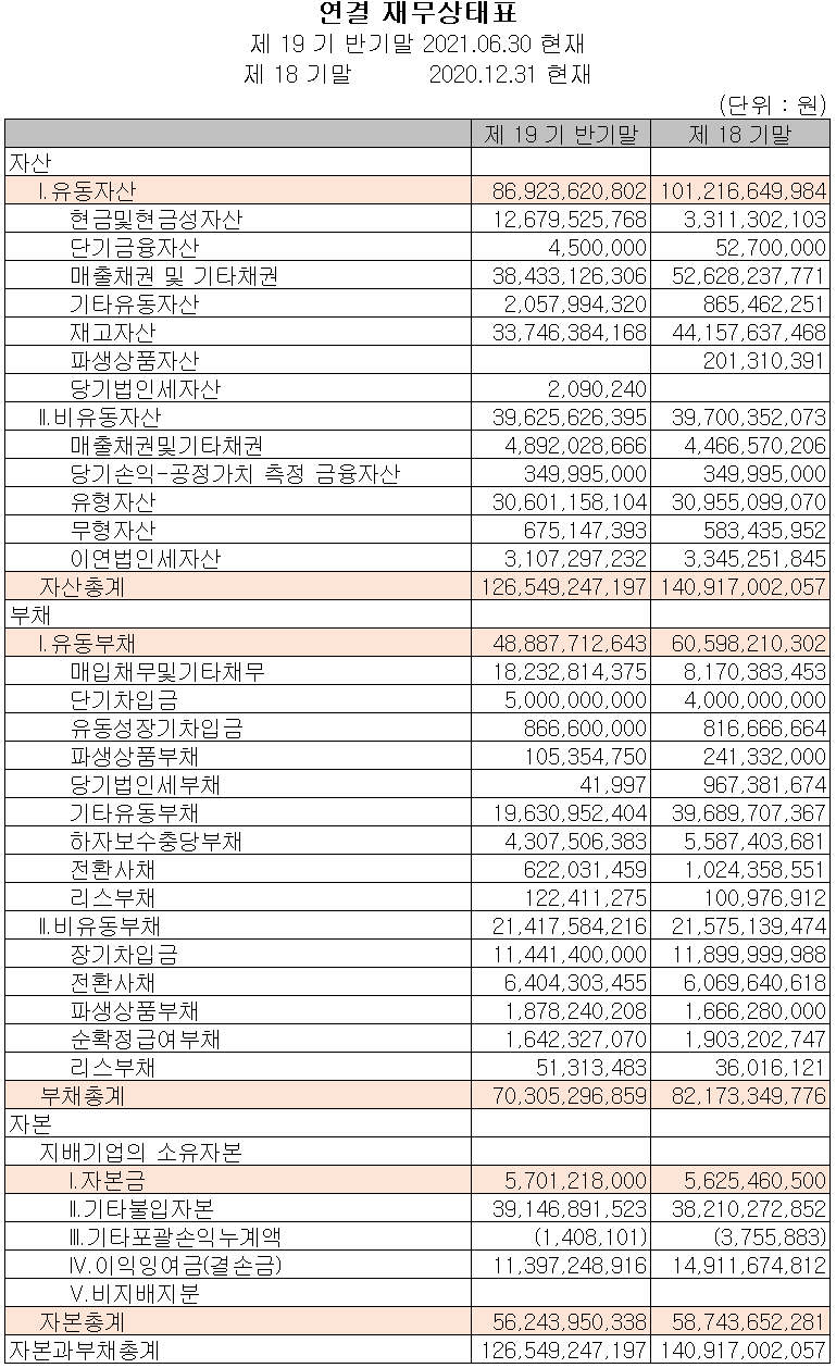 2021년 6월 30일 기준 당사의 자산 총계는 전기보다 10.2%(144억 원) 감소한 1,265억 원으로 매출채권과 재고자산의 감소에 기인합니다. 부채 총계는 14.4%(119억 원) 감소한 703억 원으로 차입금 및 매입채무는 증가했으나 유동부채의 감소가 주된 요인입니다.