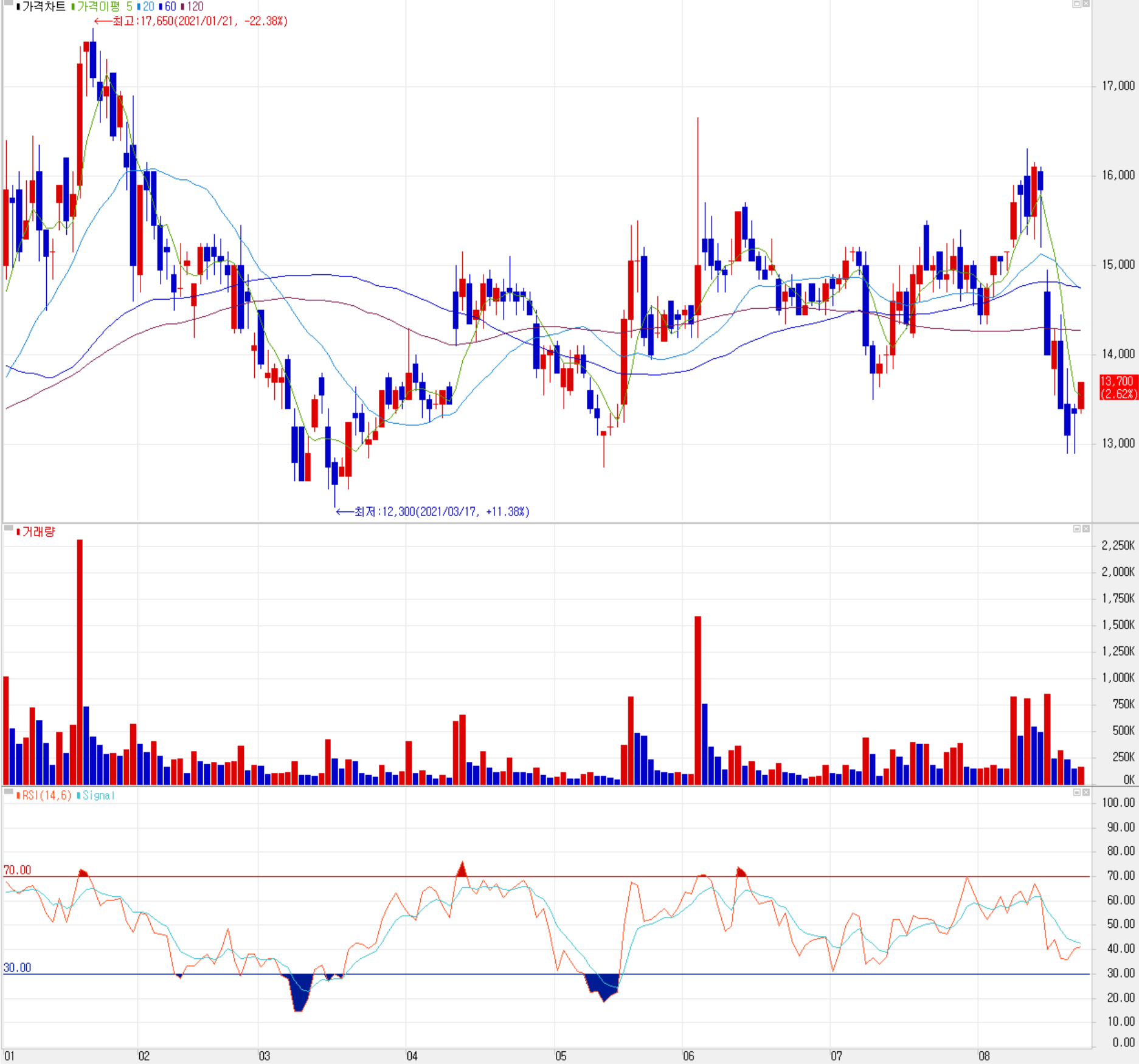 시장 수급 변동에 따른 조정을 거친 당사의 주가는 8월 초까지 한때는 16,000원 선을 넘어서면서 좋은 흐름을 이어갔으나, 미국 테이퍼링 이슈에 따른 외국인의 이탈로 14,000원을 하향돌파하면서 현재는 13,000원도 위협받는 상황입니다. 개인과 외국인의 매도세가 강한 가운데 기관이 소화하는 수급상황이 전개되고 있습니다. 당사의 중장기 주가의 방향은 최근 설립된 미국 법인을 통한 수주 확대가 결정할 것으로 예상되지만 그 이전까지는 변동성을 감안해야 할 것 같습니다. 또한 2분기 급감한 실적에 따른 불안감을 하반기에 해소해야 하는 숙제도 가지고 있습니다. 이러한 상황과 차트 소견을 종합해볼 때 개인적으로 목표주가는 17,000원으로 설정하였고 조정 시 진입하되, 12,500원을 손절가로 보고 단기적인 대응을 하겠습니다.
