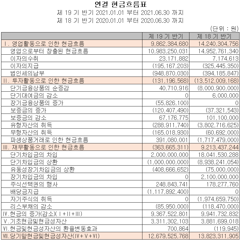당사의 지난 상반기 영업활동 현금흐름에서는 매출채권 및 재고자산이 감소하면서 총 99억 원의 현금이 유입되었습니다. 투자활동에서는 유무형 자산의 취득으로 1.3억 원의 현금이 유출되었으며, 재무활동에서는 차입금을 조달하여 부채를 상환하고, 배당금을 지급하면서 총 3.6억 원의 현금이 유출되었습니다. 2021년 상반기 말 기준 현금 및 현금성 자산은 전년 동기 대비 11억 원이 감소한 127억 원을 보유하고 있습니다.