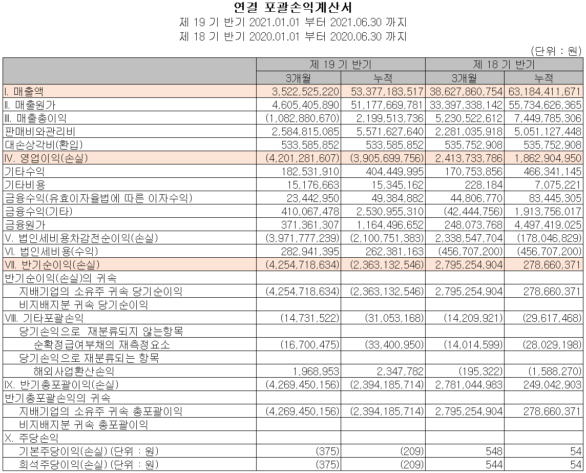 당사의 지난 2분기 실적에서는 매출액 35억 원으로 전년 동기 대비 90.9% 감소했고, 영업손실 42억 원, 당기순손실 43억 원으로 적자 전환했습니다. 2분기 중 일부 매출 인식 지연 등의 발생으로 실적이 급감했으나, 보고서 기준일인 8월 13일 현재 수주잔고가 1,030억 원으로 상반기 이미 지난해 수준의 매출은 확보한 것으로 추정됩니다.