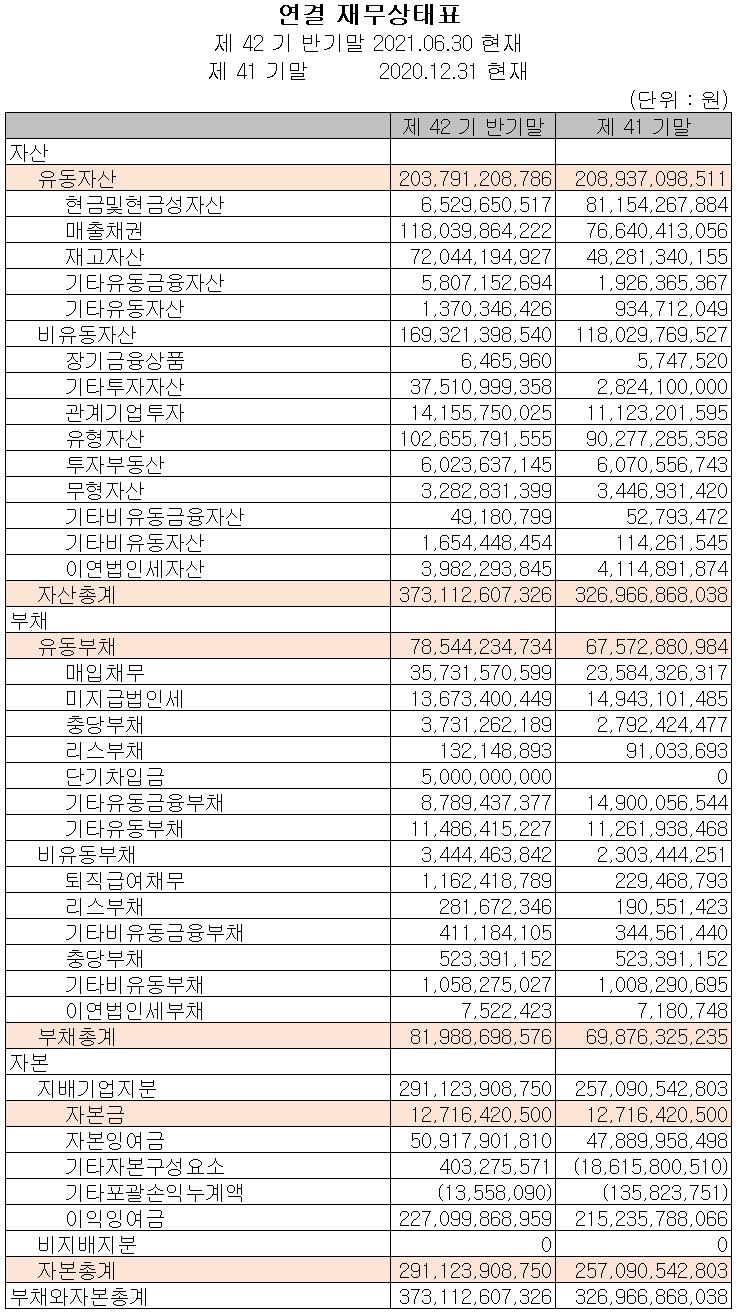 당사의 지난 상반기 말 기준 자산총계는 전기 대비 14.1%(461억 원) 증가한 3,731억 원으로 매출채권, 재고자산 및 유형 자산의 증가에 기인합니다. 부채는 17.3%(121억 원) 증가한 820억 원으로 매입 채무 및 단기 차입금 조달로 인한 증가입니다.