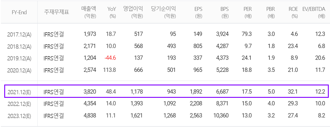 2021년 연간 추정실적에서는 매출액 3,820억 원으로 전년 대비 48.4% 증가하고, 영업이익은 1,178억 원으로 76.9% 증가할 것으로 추정했습니다. 일본 디스코사를 주로 수입해오던 마이크로 쏘를 국산화하면서 당사의 비전플레이스먼트와 함께 꾸준한 수요가 예상됩니다.