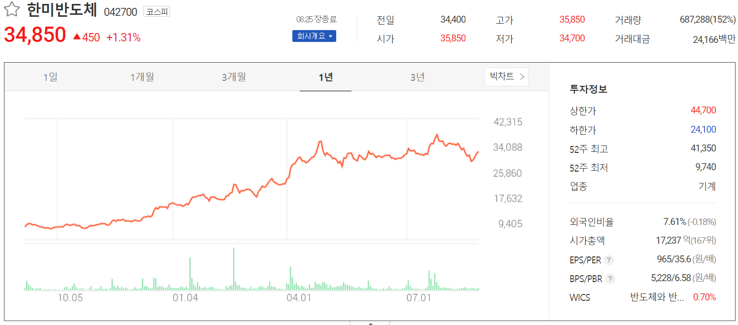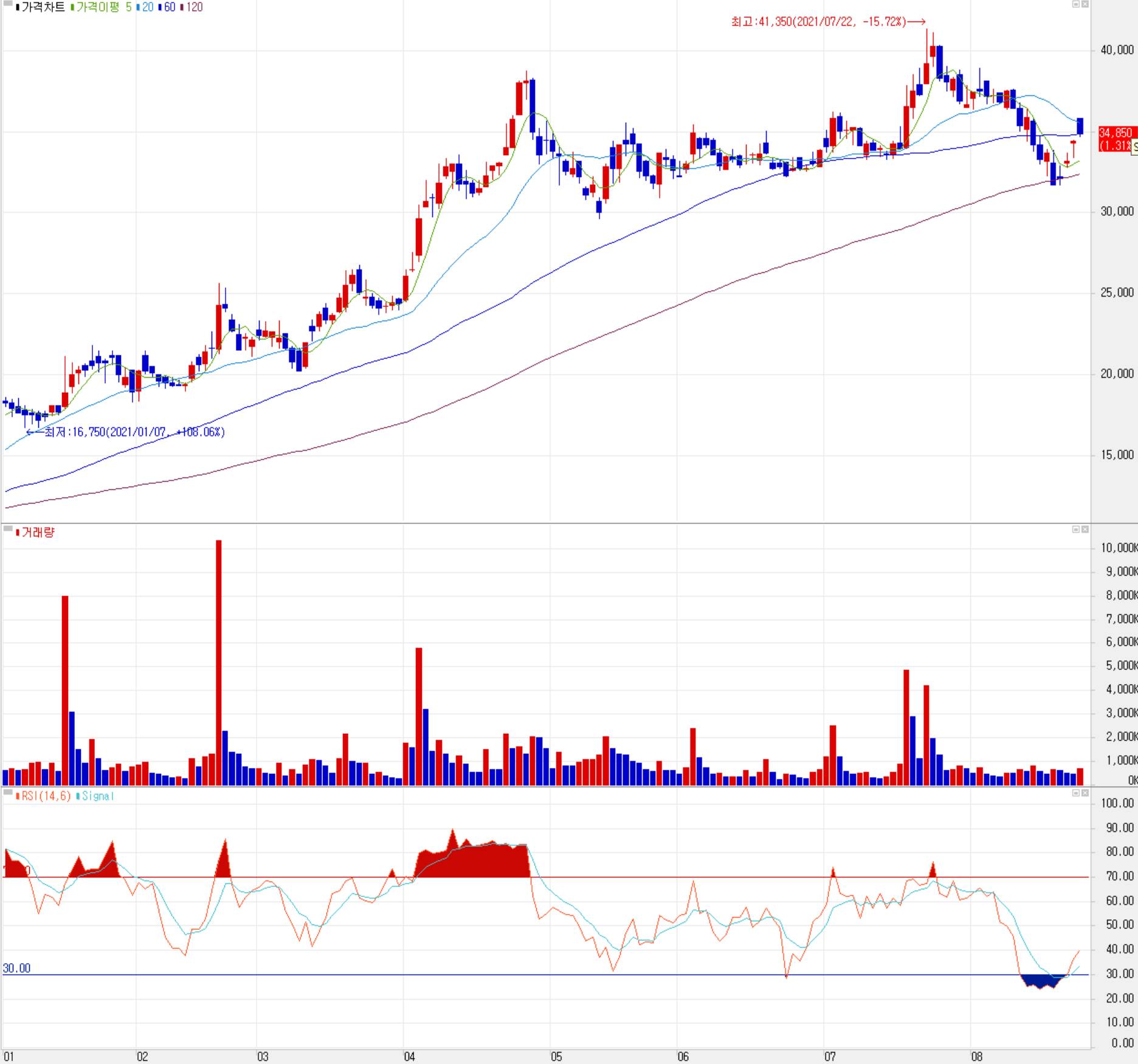 8월 25일 장 종료 기준 당사의 주가는 전 거래일보다 1.31% 오른 34,850원에 거래를 마감했습니다. 외국인 비중은 7.61%이며 시가 총액 1조 7,237억 원으로 코스피 시총 기준 167위 종목입니다.