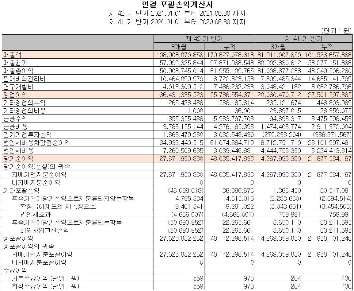당사의 지난 2분기 실적은 매출액 1,089억 원으로 전년 동기 대비 75.9% 증가했고, 영업이익은 364억 원으로 81.6% 증가, 당기순이익은 277억 원을 기록하면서 93.9% 증가했습니다.