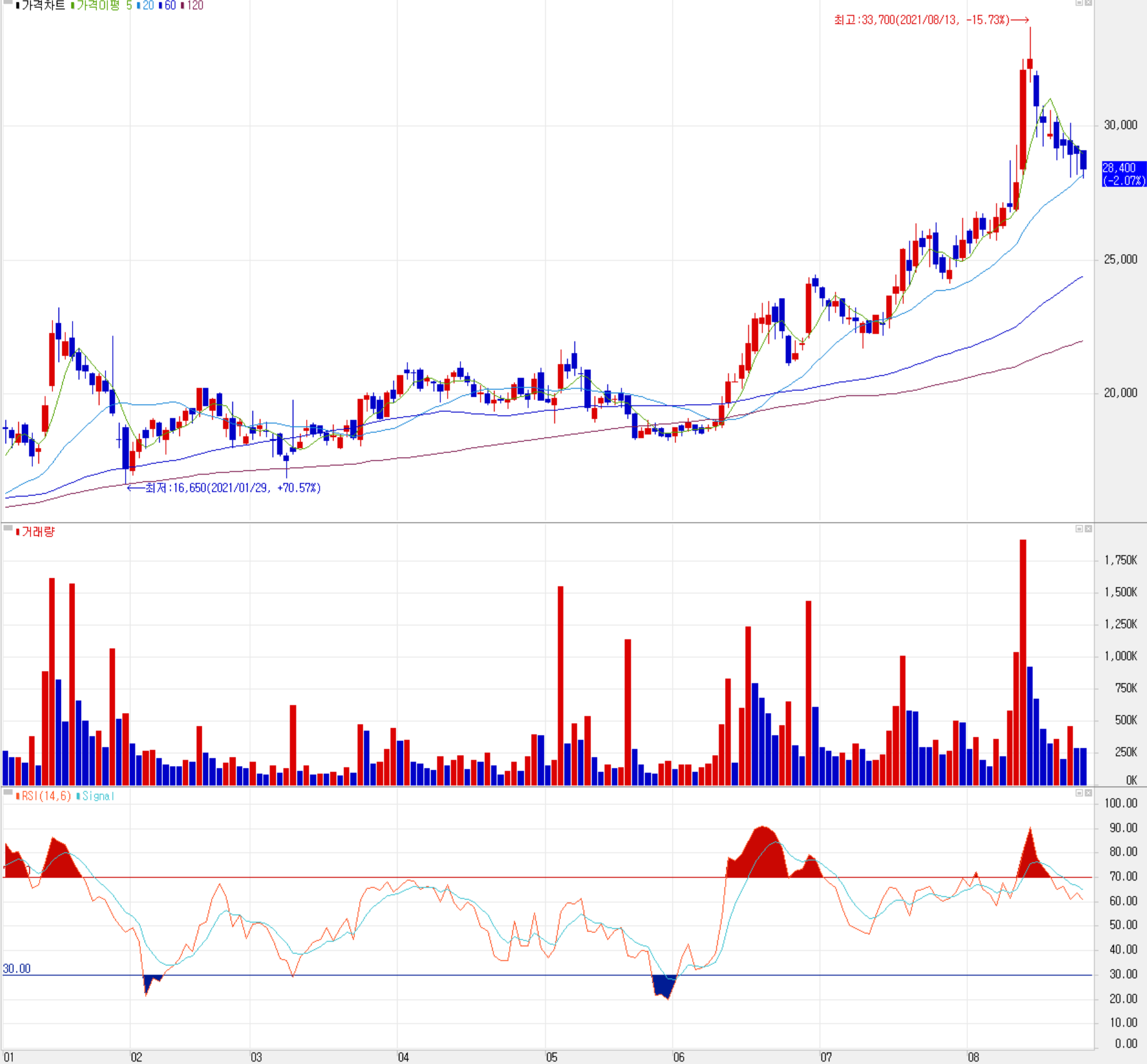 당사의 주가는 2021년 하반기 반도체 신규 소재 및 2차전지 전해액 첨가제 공급 개시 등에 따른 기대감으로 지난 6월 20,000원에서 연중 최고점인 33,700원까지 상승하다가 최근 조정을 받고 있습니다. 주가 상승을 이끌었던 기관은 최근 매도로 돌아서면서 개인이 받아내는 모습을 보이고 있습니다. 예상 실적 및 차트 소견 상 개인적인 목표주가는 32,000원으로 중장기적으로 매력적인 종목이지만 최근 급등에 따른 부담으로 당분간 관망할 예정입니다.