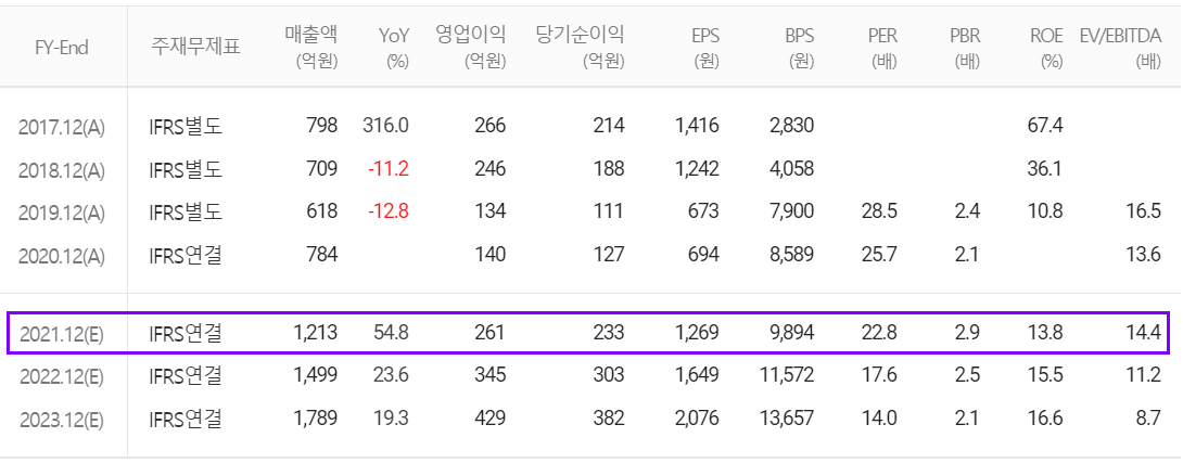 당사의 2021년 연간 예상실적에서는 매출액 1,213억 원으로 전년 대비 54.8% 증가하고, 영업이익은 261억 원으로 86.4% 증가할 것으로 추정했습니다. OLED 사업부문에서는 고객사의 아이폰 신제품과 삼성전자 폴더블폰 출시에 따라 꾸준한 수요 증가가 예상되며, 반도체 부문의 128단 NAND 고단화 수요에 따른 성장이 예상됩니다.