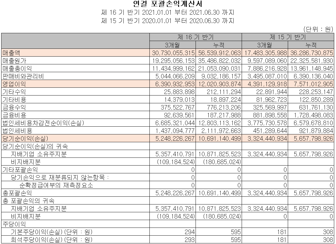 지난 2분기 당사의 실적은 매출액 307억 원으로 전년 동기 대비 75.8% 증가했고, 영업이익은 64억 원으로 45.5% 증가, 당기순이익은 52억 원을 기록하면서 57.9% 증가했습니다. 디스플레이 소재 수요 증가 및 반도체 부문의 고객사 NAND 출하량이 증가하면서 실적이 호전되었습니다.