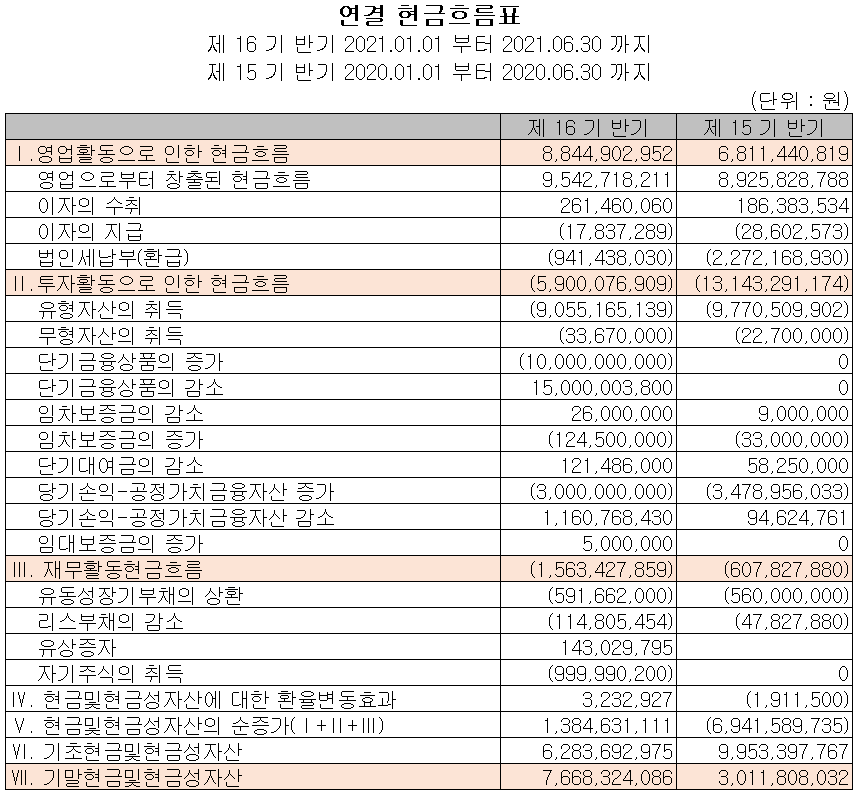 당사의 지난 상반기 영업활동 현금흐름에서는 총 88억 원의 현금이 유입되었으며, 투자활동에서는 유무형 자산의 취득과 금융자산의 증가로 59억 원의 현금이 유출되었습니다. 재무활동에서는 부채의 상환과 10억 원 규모의 자기 주식을 취득하면서 16억 원의 현금이 유출되었습니다. 2021년 6월 30일 기준 당사의 현금 및 현금성 자산은 전년 동기 대비 47억 원이 증가한 77억 원을 보유하고 있습니다.