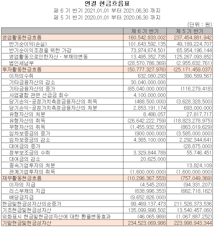 지난 상반기 영업활동 현금흐름에서는 총 1,605억 원의 현금이 유입되었습니다. 투자활동에서는 기타금융자산의 증가 및 유무형 자산의 취득으로 총 508억 원의 현금이 유출되었습니다. 재무활동에서는 리스부채의 지급 및 배당금 지급 등으로 103억 원의 현금이 유출되었습니다. 2021년 6월 30일 기준 현금 및 현금성 자산은 전년 동기 대비 105억 원이 증가한 2,345억 원을 보유하고 있습니다.