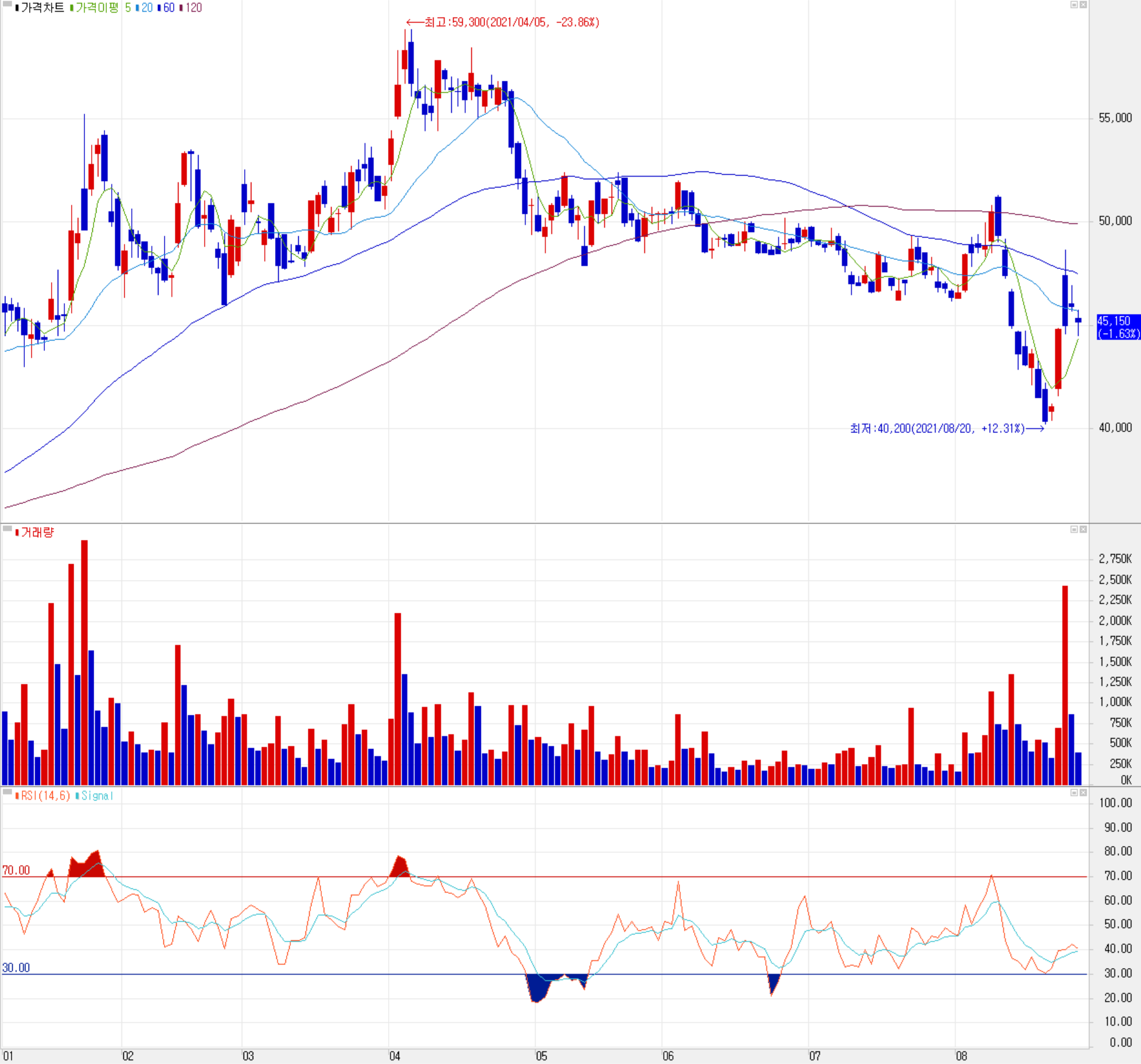 지난 4월 인플레이션 이슈 등으로 시장 변동성에 따른 조정을 받은 후 50,000원 부근에서 형성되는 주가는 8월 들어 반등을 시도했으나, 내년부터 반도체 D램 가격의 하락을 예상하는 시장 전망이 나오면서 주가는 4만 원 부근까지 급락했다가 최근 삼성전자가 240조 투자를 발표하면서 반등하였으나 변동성을 보이면서 현재 45,000원 근처에서 주가가 형성되고 있습니다. 8월 한 달 수급에서는 주로 개인의 매수 우위에 기관과 외국인은 매도로 맞서는 모습입니다. 차트 소견 및 예상 실적을 종합한 개인적인 목표주가는 60,000원으로 설장하였으나 신규 진입은 반도체 시장 상황(2022년 D램 가격 전망, 삼성전자 240조 투자 등)을 좀 더 지켜본 후 고려할 예정입니다.