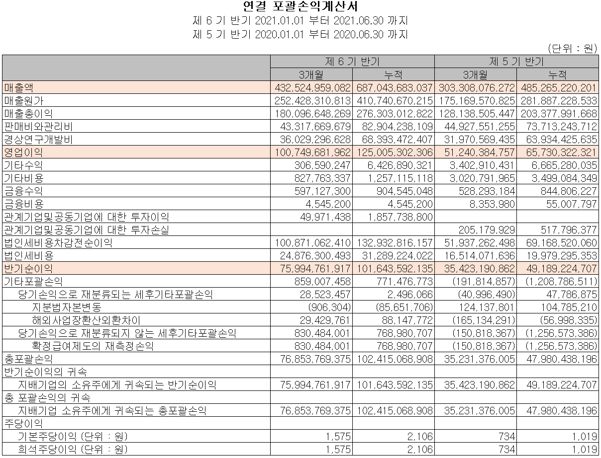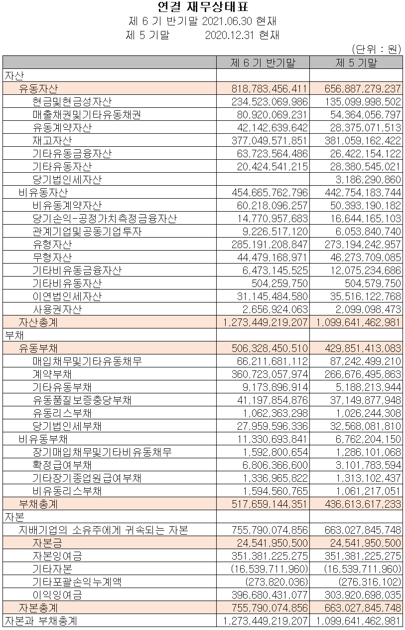 2021년 상반기 말 기준 자산총계는 전기보다 15.8%(1,738억 원) 증가한 1조 2,734억 원으로 현금 및 현금성 자산, 매출채권, 기타유동금융자산 및 유형 자산 등의 증가에 기인합니다. 부채는 18.6%(810억 원) 증가한 5,177억 원으로 계약부채의 증가가 주된 요인입니다.