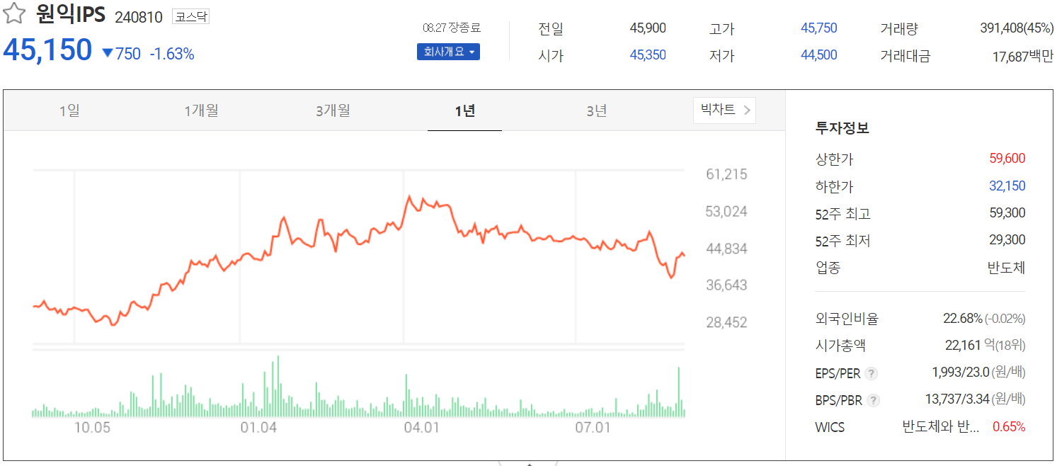 8월 27일 장 종료 기준 주가는 전 거래일보다 1.63% 내린 45,150원에 거래를 마감했습니다. 외국인 비중은 22.68%이며, 시가 총액 2조 2,161억 원으로 코스닥 시총 기준 18위 종목입니다.