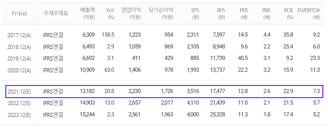 2021년 연간 추정 실적에서는 매출액 1조 3,182억 원으로 전년 대비 20.8% 증가하고, 영업이익은 2,230억 원으로 58.6% 증가할 것으로 추정했습니다.