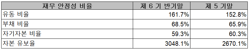 2021년 6월 30일 기준 재무 안정성 비율에서는 유동비율 161.7%, 부채비율 68.5%, 자기자본비율 59.3%, 자본유보율 3,048.1%를 기록하면서 전반적으로 건실하고 안정적인 재무상태를 유지하고 있습니다.