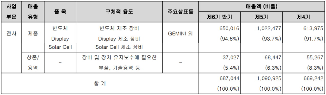 당사는 반도체, 디스플레이 및 태양전지 등 첨단 산업의 제조 공정용 장비를 개발, 공급하고 있습니다. 지난 상반기 매출 중 제품의 매출은 6,500억 원으로 전체 매출의 94.6%를 차지하였으며, 관련 제품의 유지보수에 필요한 부품 및 기술용역의 매출이 370억 원으로 전체 매출의 5.4%를 기록했습니다.