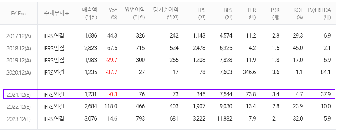 당사의 2021년 연간 추정실적은 매출액 1,231억 원으로 전년 대비 0.3% 감소하고, 영업이익은 76억 원으로 181.5% 증가할 것으로 추정했습니다. 2021년 실적은 작년에 이어 부진할 것으로 전망하고, 2022년 DDR5 메모리로의 전환에 따른 테스트 수요가 증가하면서 실적 개선이 있을 것으로 전망하고 있습니다.