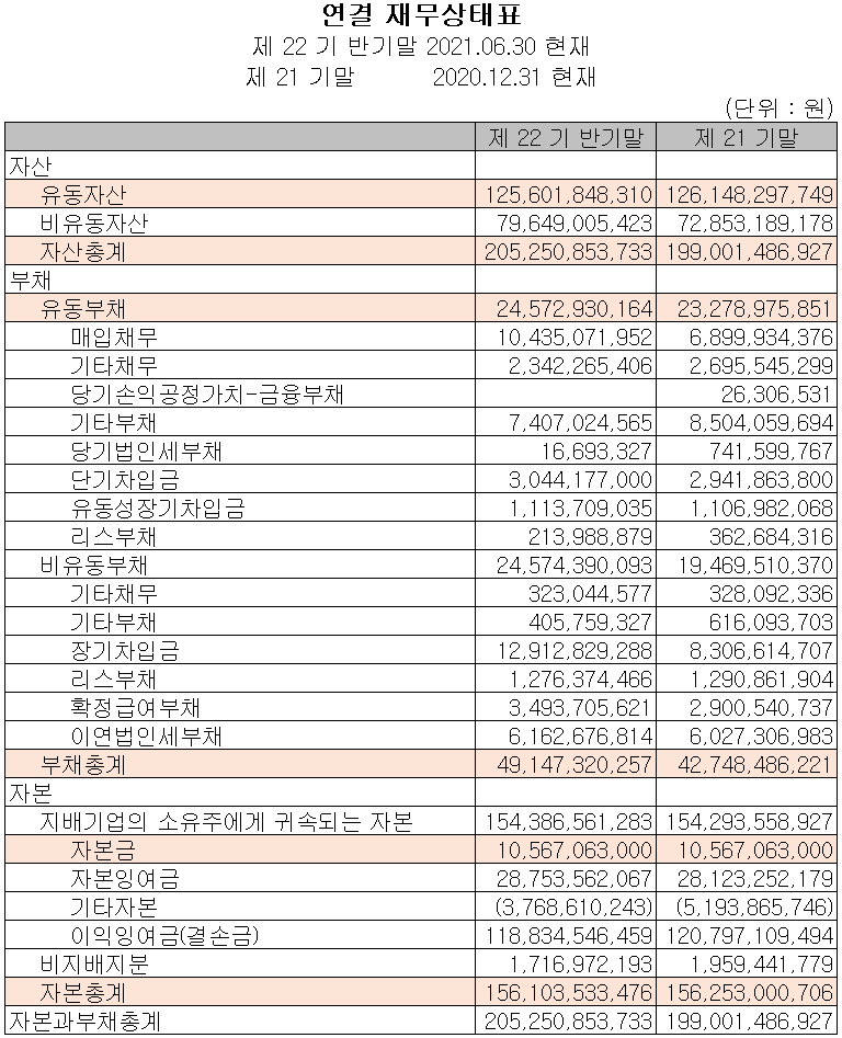 2021년 6월 30일 기준 자산 총계는 전기보다 3.1%(62억 원) 증가한 2,053억 원으로 현금성 자산은 감소했으나, 설비투자로 인해 유무형 자산이 증가하였습니다. 부채 총계는 15%(64억 원) 증가한 491억 원으로 매입채무 및 장기차입금의 증가에 기인합니다.