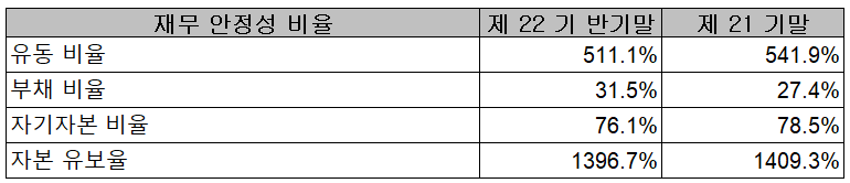 지난 2021년 상반기 말 기준 재무 안정성 비율에서는 유동비율 511.1%, 부채비율 31.5%, 자기자본비율 76.1%, 자본유보율 1,396.7%를 기록하면서 전반적으로 풍부한 유동성과 안정적인 재무상태를 유지하고 있습니다.