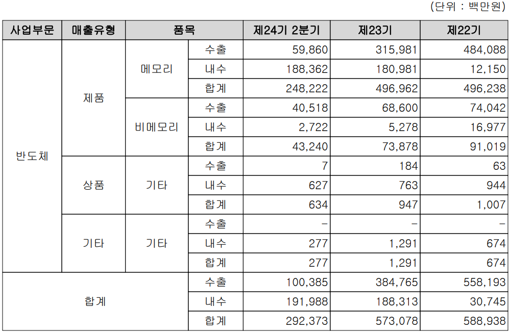 당사는 반도체 제조 단일 사업부문으로 되어 있으며, 세부적으로는 메모리 및 비메모리 영역의 후공정에 해당되는 패키징과 테스트를 제공하고 있습니다. 지난 상반기 메모리 부문의 매출액은 2,482억 원으로 전체 매출의 84.9%를 차지하였으며, 비메모리는 432억 원으로 14.8%의 매출 비중을 기록했습니다.