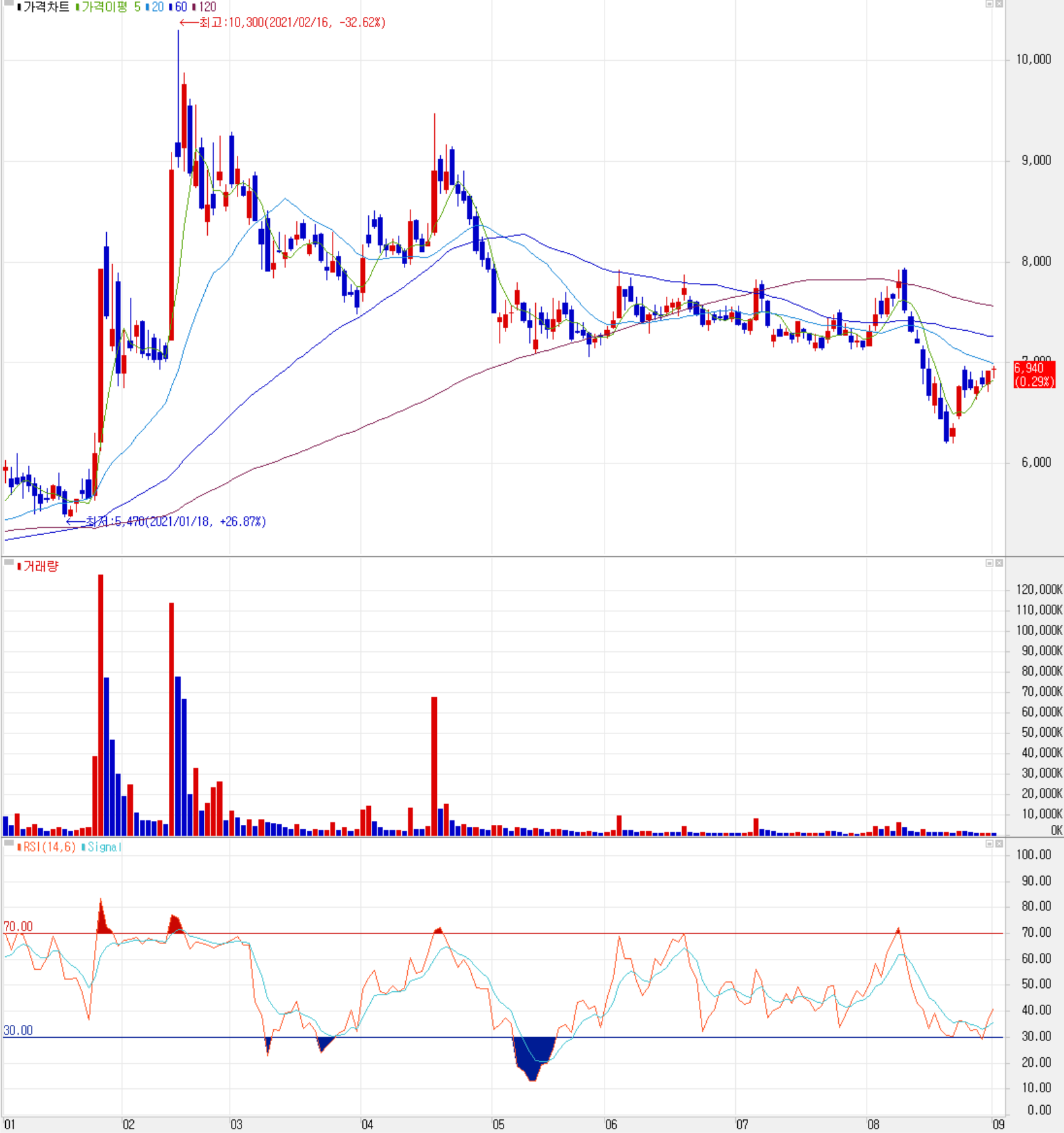 지난 8월 당사의 주가는 삼성전자 240조 투자소식과 2022년 D램 가격 하락 전망이 교차하면서 주가가 변동성을 보였고, 최근에는 6,000원 대 후반에서 주가가 형성되고 있습니다. 최근 수급에서는 외국인의 매수세가 유입되고 있으며 개인은 매도 우위를 나타내고 있습니다. 차트 소견 및 예상 실적을 종합한 개인적인 목표주가는 8,000원으로 단기 설정하고, 향후 주가 추이는 D램 가격 이슈와 삼성전자 세부 투자 계획에 대한 모니터링이 필요하겠습니다.