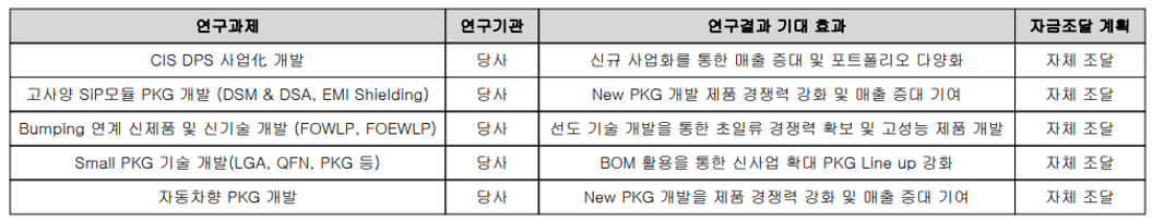 당사는 매출 증대와 성장을 위한 신규 사업으로 CIS DPS, 고사양 SIP 패키지, Bumping 및 자동차향 패키지 개발 등을 수행할 예정입니다.