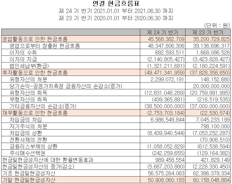 2021년 상반기 영업활동 현금흐름에서는 총 456억 원의 현금이 유입되었으며, 투자활동에서는 유형자산 및 금융자산의 증가로 495억 원의 현금이 유출되었습니다. 재무활동에서는 차입금을 조달하여 부채를 상환하면서 28억 원의 현금이 유출되었습니다. 2021년 6월 30일 기준 현금 및 현금성 자산은 전년 동기 말 대비 92억 원이 줄어든 509억 원을 보유하고 있습니다.