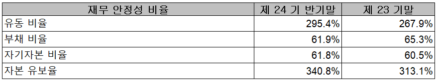 2021년 상반기 말 현재 재무 안정성 비율에서는 유동비율 295.4%, 부채비율 61.9%, 자기자본비율 61.8%, 자본유보율 340.8%를 기록하면서 전반적으로 양호한 재무상태를 유지하고 있습니다.