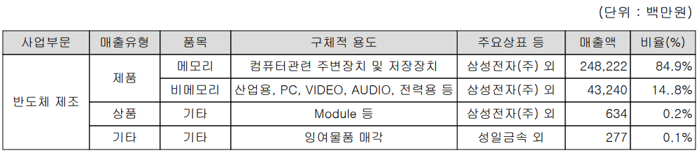 당사는 반도체 제조 단일 사업부문으로 되어 있으며, 세부적으로는 메모리 및 비메모리 영역의 후공정에 해당되는 패키징과 테스트를 제공하고 있습니다. 지난 상반기 메모리 부문의 매출액은 2,482억 원으로 전체 매출의 84.9%를 차지하였으며, 비메모리는 432억 원으로 14.8%의 매출 비중을 기록했습니다.