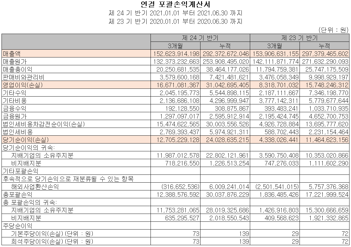 지난 2분기 실적은 매출액 1,526억 원으로 전년 동기 대비 0.8% 감소했고, 영업이익은 167억 원으로 100.4% 증가, 당기순이익은 127억 원으로 192.9% 증가했습니다. 전년 동기 대비 매출은 소폭 감소하였으나, 매출 원가 및 판관비 부담이 감소하면서 이익규모는 크게 증가하였습니다.