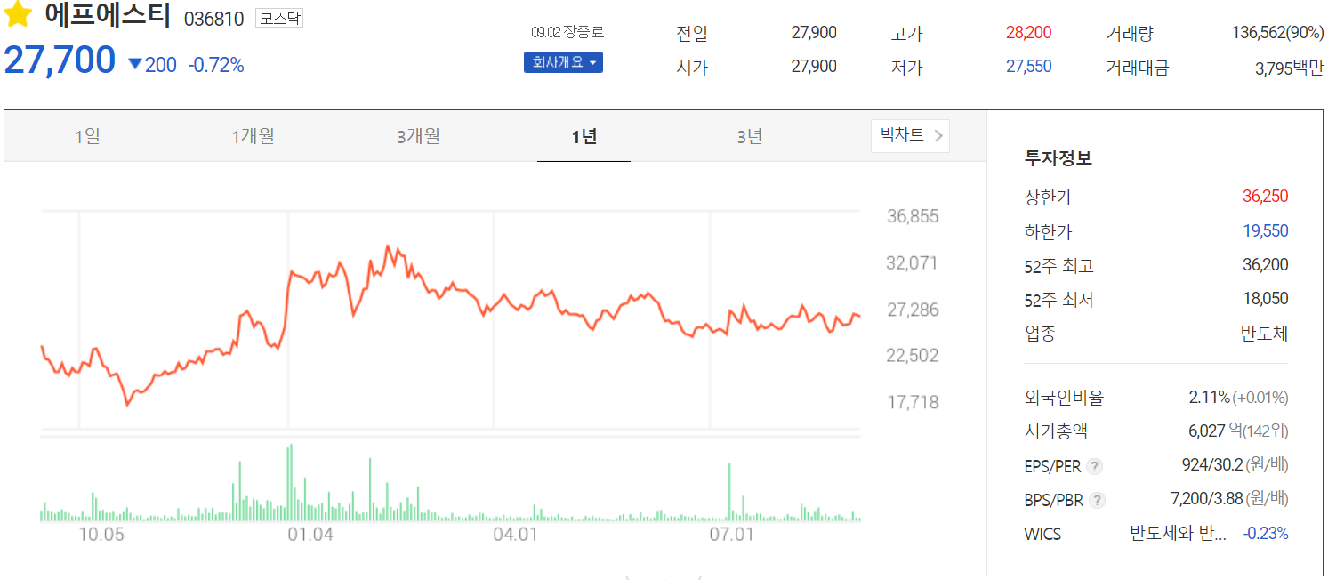 9월 2일 장 종료 기준 당사의 주가는 전 거래일보다 0.72% 내린 27,700원에 거래를 마감했습니다. 외국인 비중은 2.11%이며, 시가 총액 6,027억 원으로 코스닥 시총 기준 142위 종목입니다.