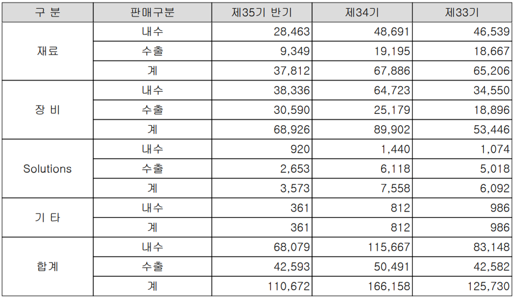 당사는 반도체 및 디스플레이 공정에 사용되는 포토마스크를 이물질로부터 보호하기 위해 사용되는 펠리클 및 펠리클 제조용 프레임을 제조, 공급하는 재료 사업부문과 반도체 공정 중 온도조절 장비인 칠러 및 레이저 드릴 장비를 공급하고 있는 장비 사업부문으로 구분되어 있습니다. 지난 2021년 상반기 재료 부문의 매출은 348억 원으로 전체 매출의 31.5%를 차지하였고, 장비 사업부문의 매출액은 719억 원으로 65%의 매출 비중을 기록했습니다.