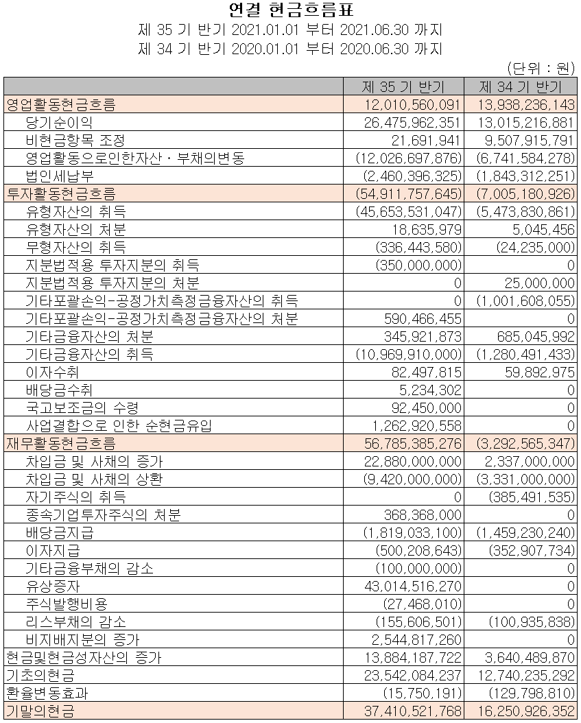 2021년 상반기 영업활동 현금흐름은 당기순이익의 증가로 인해 120억 원의 현금이 유입되었습니다. 투자활동에서는 유무형 자산 및 금융 자산의 취득으로 총 549억 원의 현금이 유출되었습니다.
