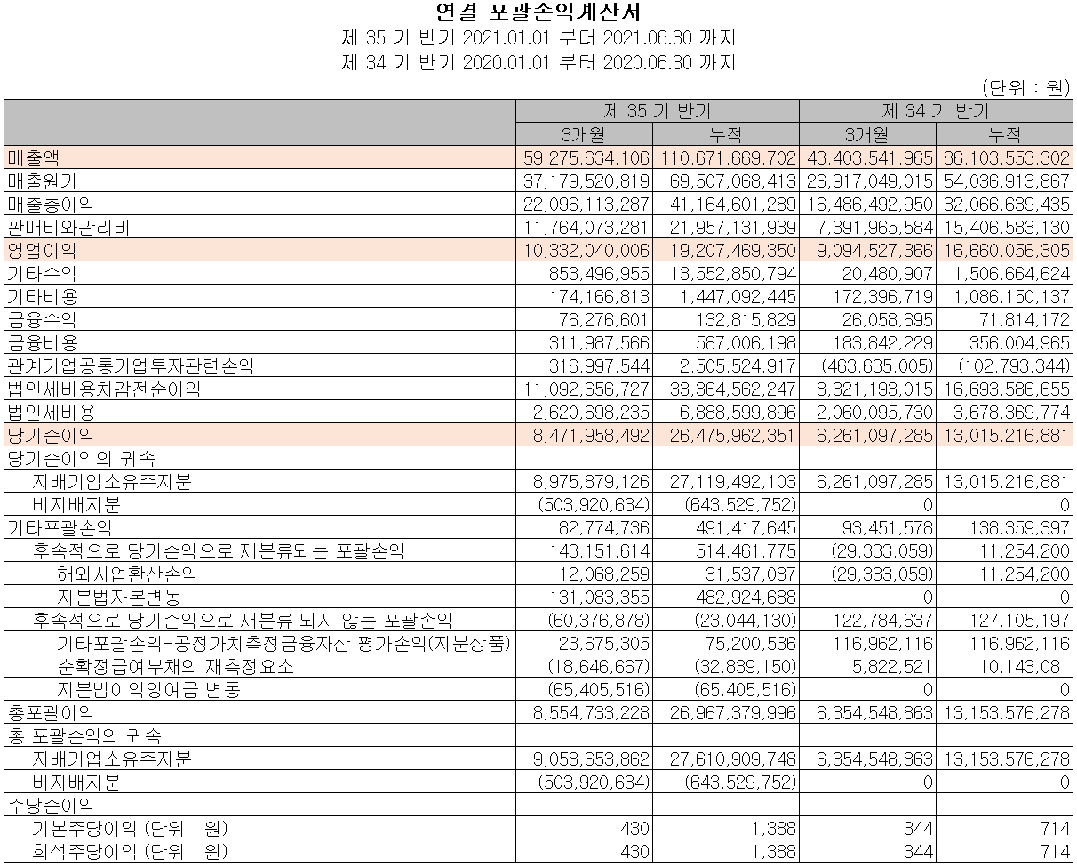 2021년 2분기 당사의 실적은 매출액 593억 원으로 전년 동기 대비 36.6% 증가했고, 영업이익은 103억 원으로 13.6% 증가, 당기순이익은 85억 원을 기록하면서 35.3% 증가했습니다. 재료 부문의 꾸준한 실적을 기반으로 칠러 장비의 수요가 증가하면서 전반적인 실적 향상을 이끌었습니다.