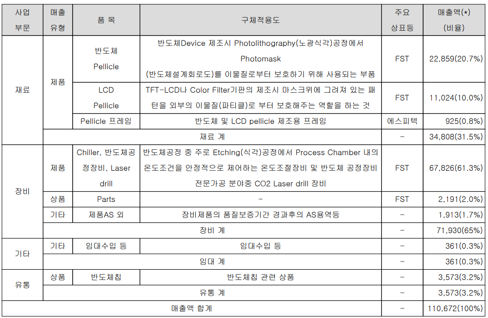 당사는 반도체 및 디스플레이 공정에 사용되는 포토마스크를 이물질로부터 보호하기 위해 사용되는 펠리클 및 펠리클 제조용 프레임을 제조, 공급하는 재료 사업부문과 반도체 공정 중 온도조절 장비인 칠러 및 레이저 드릴 장비를 공급하고 있는 장비 사업부문으로 구분되어 있습니다. 지난 2021년 상반기 재료 부문의 매출은 348억 원으로 전체 매출의 31.5%를 차지하였고, 장비 사업부문의 매출액은 719억 원으로 65%의 매출 비중을 기록했습니다.