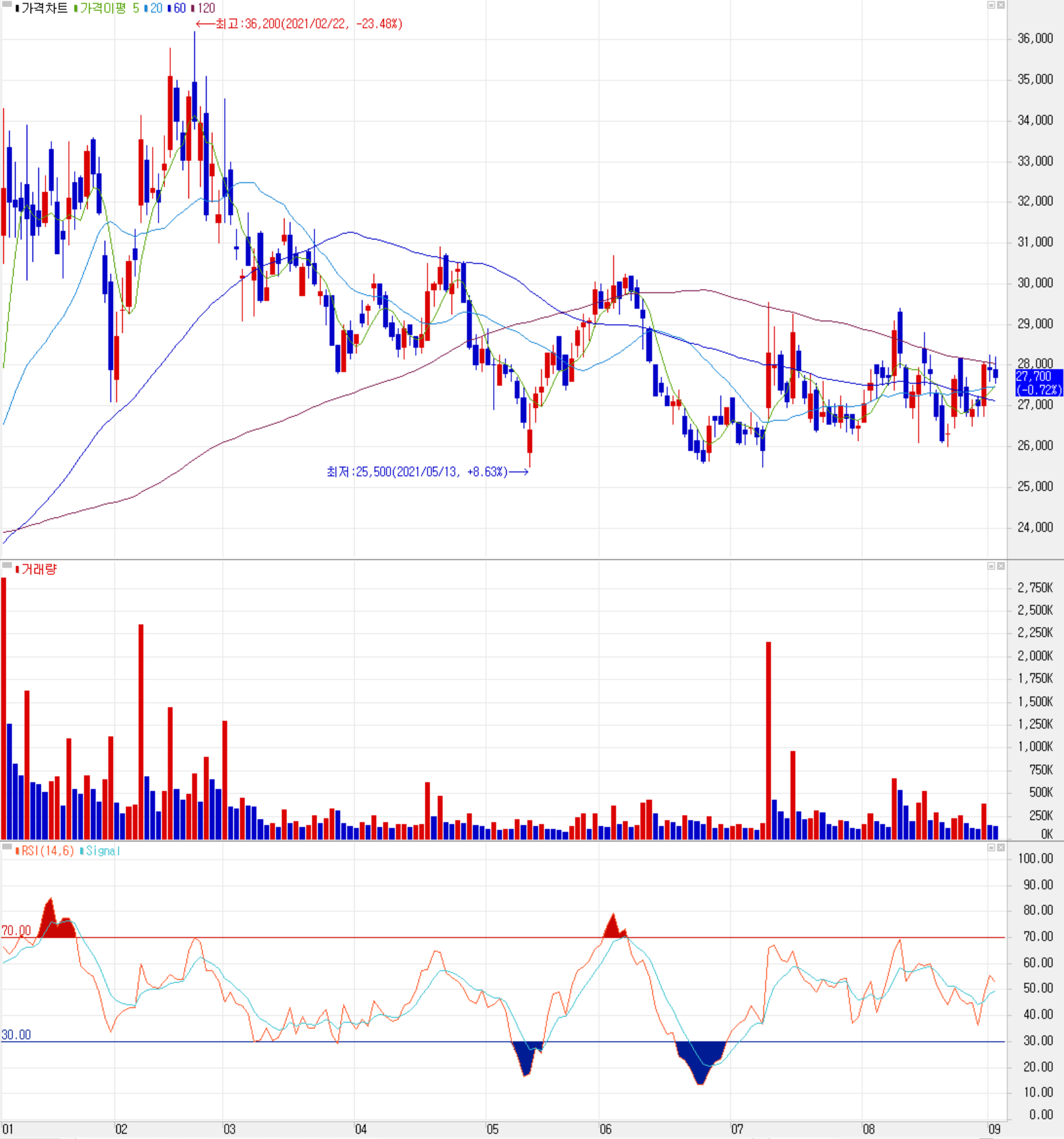 9월 2일 장 종료 기준 당사의 주가는 전 거래일보다 0.72% 내린 27,700원에 거래를 마감했습니다. 외국인 비중은 2.11%이며, 시가 총액 6,027억 원으로 코스닥 시총 기준 142위 종목입니다.