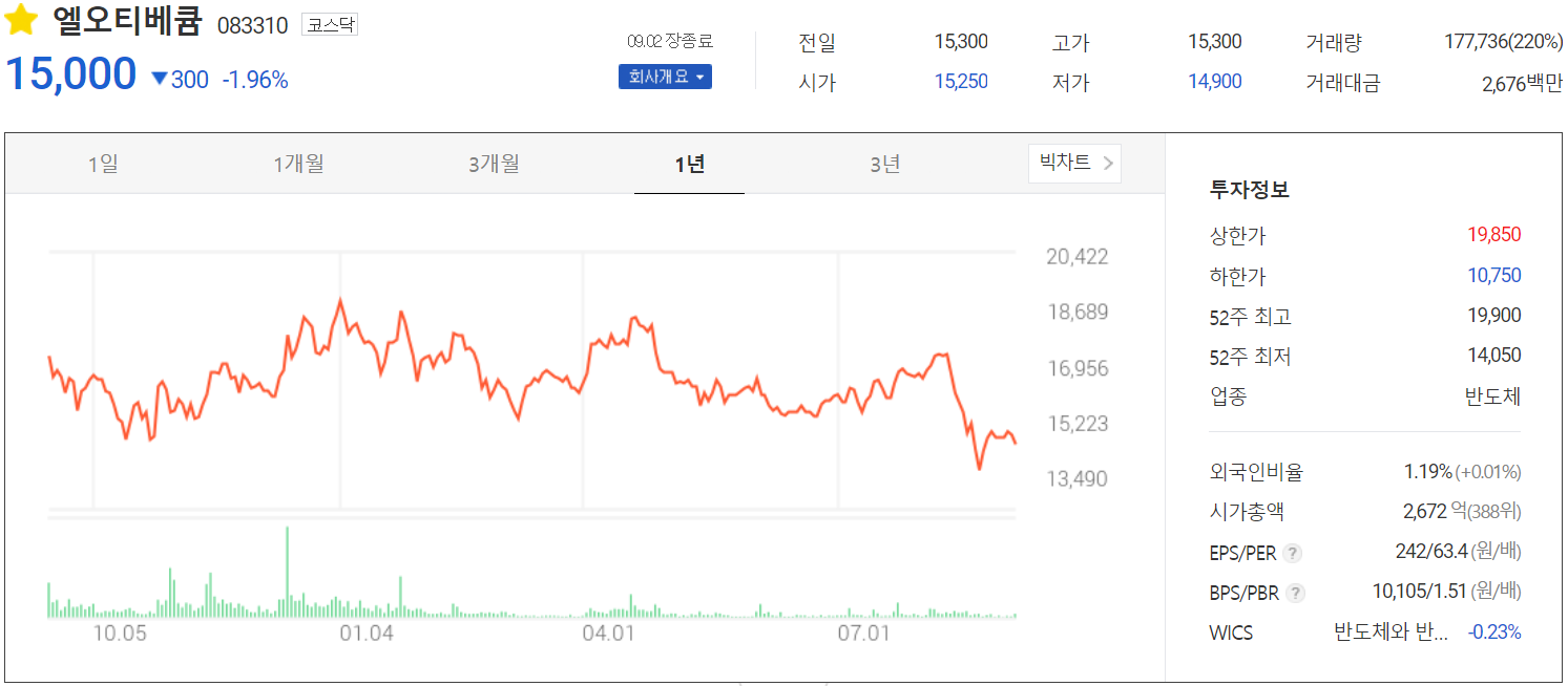 9월 2일 장 종료 기준 당사의 주가는 전 거래일보다 1.96% 내린 15,000원에 거래를 마쳤습니다. 외국인 비중은 1.19%이며, 시가 총액 2,672억 원으로 코스닥 시총 기준 388위 종목입니다.