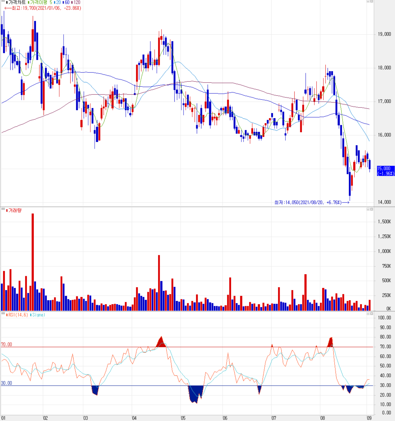 8월 중 당사의 주가는 삼성전자 240조 투자에 반등하는 듯했으나, D램 가격 하락 전망에 따른 하락세를 보이다가 최근 반등 후 15,000원 주변에서 가격이 형성되고 있습니다. 지난 한 달간 수급에서는 개인의 꾸준한 매수세에 외국인과 기관은 매도가 우세한 모습을 보이고 있습니다. 차트 소견 및 예상 실적을 종합한 개인적인 목표주가는 20,000원으로 설정했습니다.
