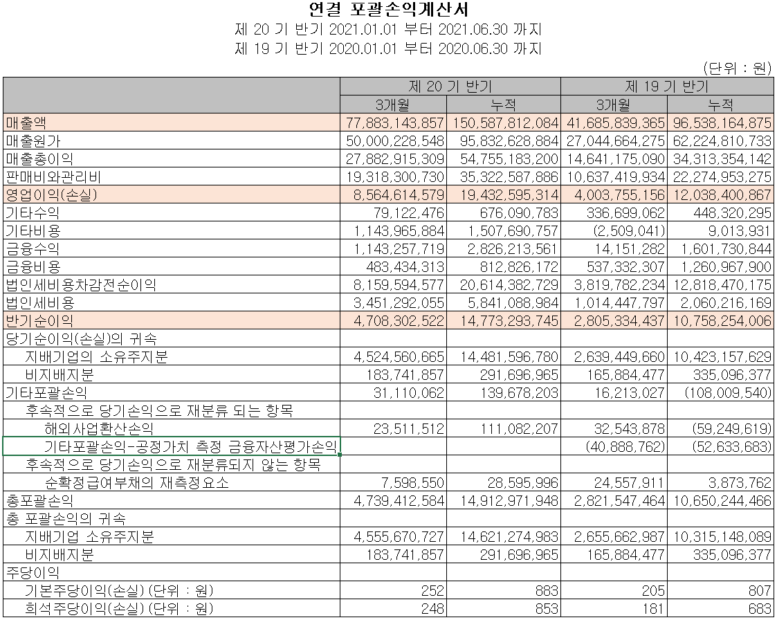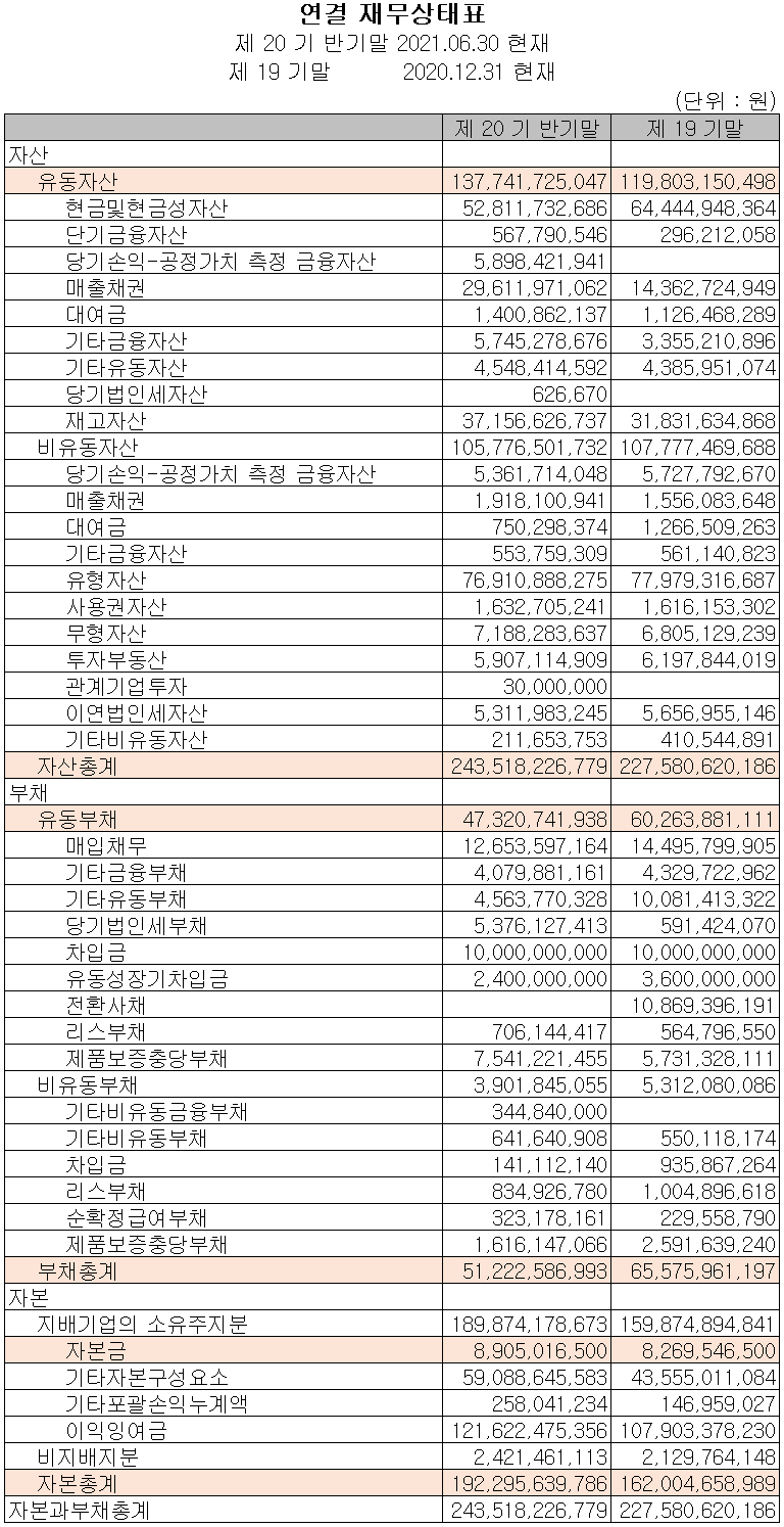 2021년 6월 30일 현재 자산 총계는 전반기 말보다 7%(159억 원) 증가한 2,435억 원으로 매출채권, 재고자산 등의 증가에 기인합니다. 부채 총계는 21.9%(144억 원) 줄어든 512억 원으로 매입채무, 기타 유동부채 및 장기차입금의 감소가 있었습니다. 자본 총계는 당반기 이익의 증가에 따라 18.7% 증가한 1,923억 원을 기록했습니다.