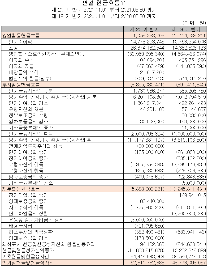 2021년 상반기 영업활동 현금흐름에서는 총 11억 원의 현금이 유입되었습니다. 투자활동에서는 공정가치 금융자산의 취득, 유형자산의 취득 등으로 69억 원의 현금이 유출되었습니다. 재무활동에서는 자기 주식을 취득하고 당기 부채를 상환하였습니다. 2021년 상반기 말 기준 현금 및 현금성 자산은 전년 동기 말 대비 60억 원이 증가한 528억 원을 보유하고 있습니다.