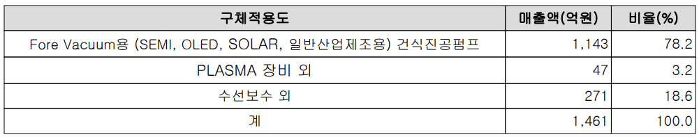 당사의 주력 제품인 건식 진공펌프는 반도체, OLED, 태양전지, 2차 전지뿐만 아니라 다양한 일반 산업 제조용으로 사용됩니다. 지난 상반기 건식 진공 펌프의 매출액은 1,143억 원으로 전체 매출의 78.2%를 차지하였으며, 지난 9월 1일 자로 물적 분할된 수선보수 사업부문의 매출인 271억 원으로 18.6%의 매출 비중을 나타냈습니다. 상반기 전체 매출에서 수출과 내수의 비중은 각각 43.2%, 56.8%를 기록했습니다.